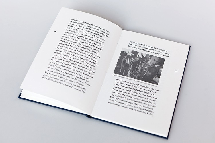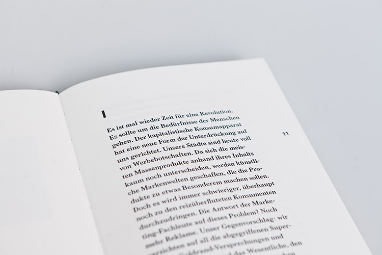 Gregor Weichbrodt und Grischa Stanjek decken mit ihrem Buchobjekt zunächst auf, wie weit die Vereinnahmung des Codes “Revolution” bereits fortgeschritten ist. Die minutiös und kunstvoll collagierten Texte, die sorgfältig kuratierten Bildmotive stoßen die Leser mitten in das, was als Konversations-Material in der Werbung verbraten wird. Dabei ist “Die Revolution” auch als Objekt konsequent und stellt bis ins Detail jeden Inhalt in einen gestalterischen Zusammenhang: Hier ist Form Inhalt und Inhalt Form. Das Buch regt auf vielen Ebenen zum Nachdenken an – mit jedem Recht auf Spaß an der Verzweiflung.